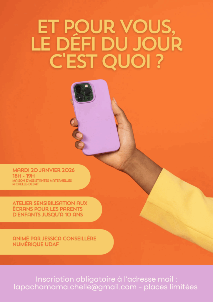 Atelier sensibilisation aux écrans Atelier sensibilisation aux écrans 53 53 people viewed this event. S’inscrire à l’évènement To register for this event email your details to lapachamama.chelle@gmail.com Inscrivez-vous via le webmail : Gmail / AOL / Yahoo / Outlook Date et heure 20.01.2026 / 18:00 à 20.01.2026 / 19:00 Lieu à la MAM Pachamama de Chelle-Debat (6 place du village) Partager avec des amis Facebook Twitter Linkedin Xing Pinterest