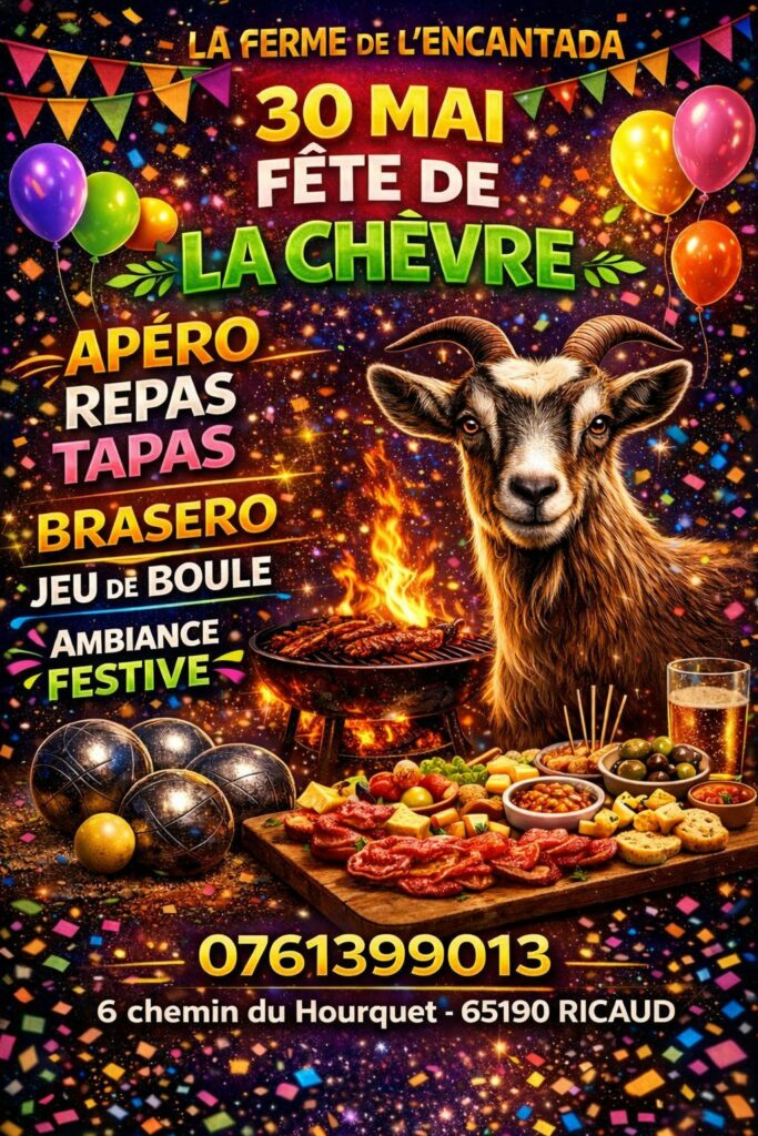 Fête de la chèvre Fête de la chèvre 5 5 people viewed this event. Additional Details Contacts - 07 61 39 90 13 S’inscrire à l’évènement Date et heure 30.05.2026 à 30.05.2026 Lieu à La Ferme de l'Encatada à Ricaud Partager avec des amis Facebook Twitter Linkedin Xing Pinterest