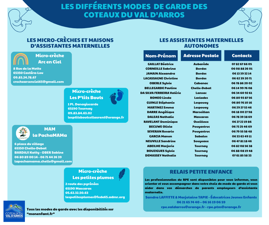 Vous trouverez ici des informations sur le RPE Val d’Arros (POUYASTRUC et TOURNAY) géré et animé par l’Association Familles Rurales du Magnoac par convention avec la Communauté de Communes ainsi que toutes les informations utiles pour trouver votre assistance maternelle.