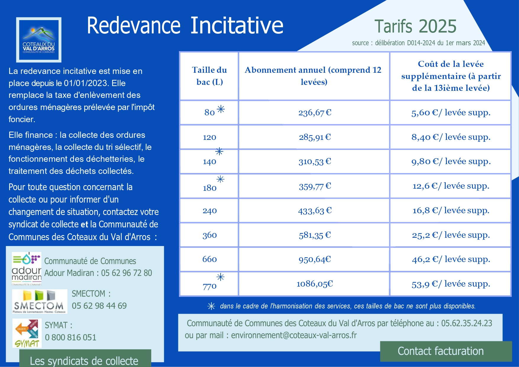 - Part fixe qui comprend l’abonnement au service (mise à disposition des bacs, fonctionnement des déchetteries, collectes des bacs, collecte et traitement du tri sélectif et des colonnes à verre…), la taxe générale sur les activités polluantes (TGAP) et un forfait de 12 levées par an.